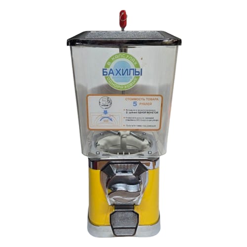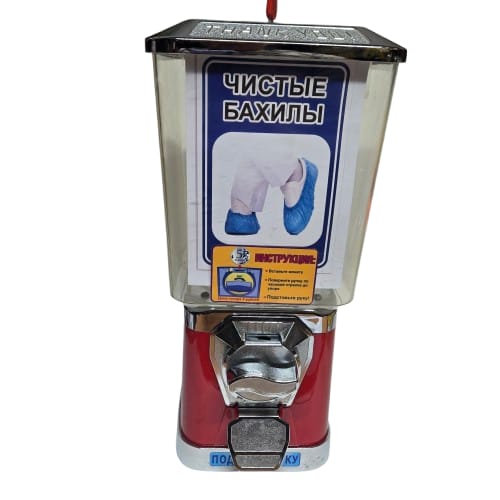 Укомплектован монетоприёмником на 5 руб. (можно заменить на 10 руб.). Подходит для продажи бахил в капсулах 28-34мм, вместимостью примерно 250-280 штук.